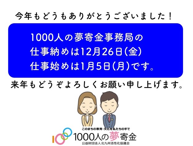 1000人の夢寄金事務局は12月26日(金)が仕事納め、