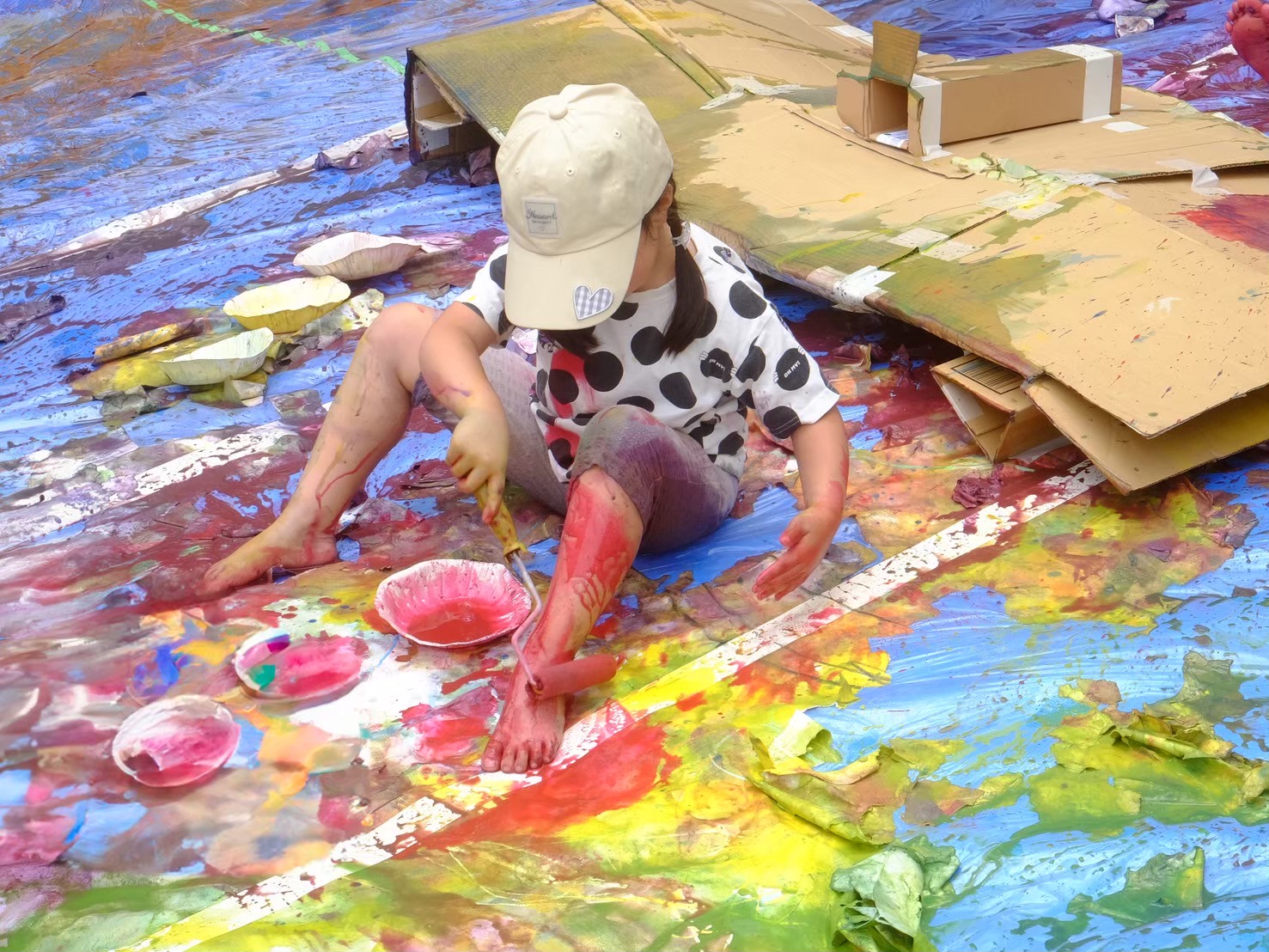 参加者が屋外で特大の紙に、絵の具を使って思いっきり自由に大胆にアートを楽しみ、自己表現。会場には子どもはもちろん、親御さんたちの満面の笑みで、会場いっぱいにハッピーがあふれていました。